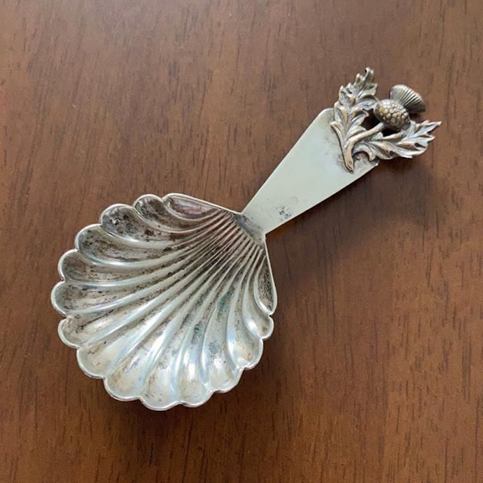 スコットランドの国花であるアザミがブラス(真鍮)で装飾されたキャディスプーンです。すくいの部分がシェルモチーフになった可愛らしいデザイン。元来は紅茶の茶葉の軽量をホタテ貝などで行っていたらしく、それの名残でティーキャディには貝殻デザインの作品が多いそうです。柄の裏側にEPNSマークがあります。