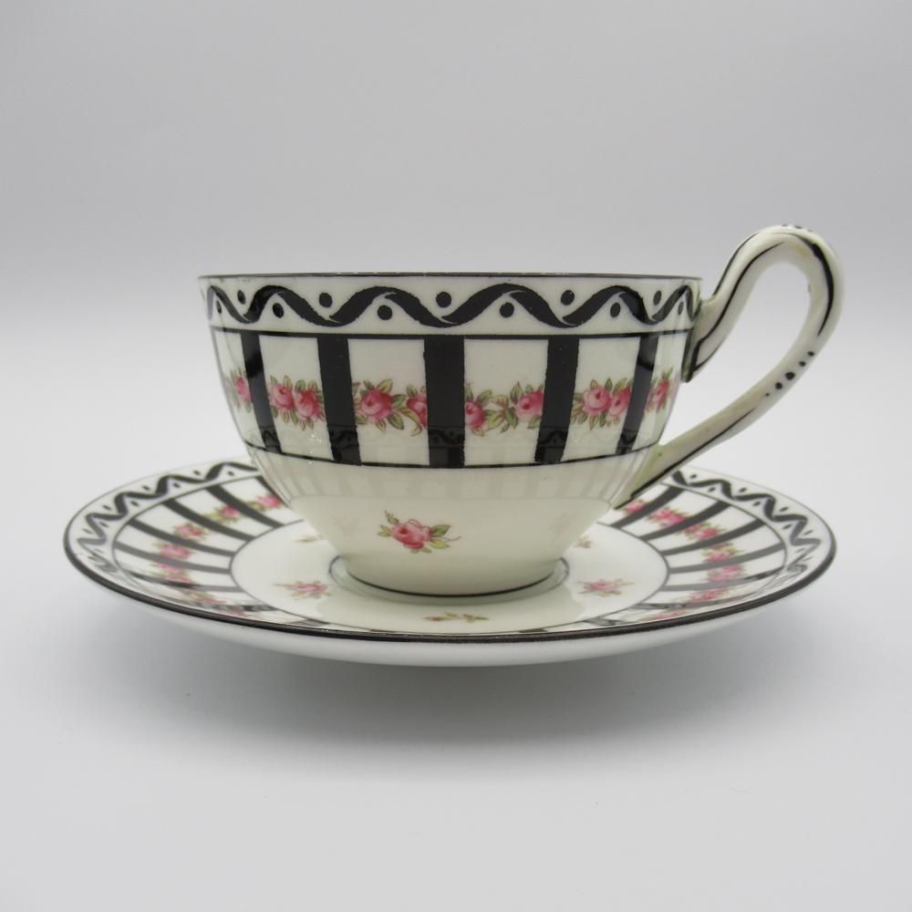 古いイギリスの窯元「コールポート」のカップ&ソーサーです。黒を使った絵柄は重くなりがちですが、こちらのカップたちは可愛らしい薔薇も相まって華やかな雰囲気があります。(薔薇の着色は手の込んだハンドペイントです)黒いストライプと幾何学模様を使ったアールデコらしいデザインです。