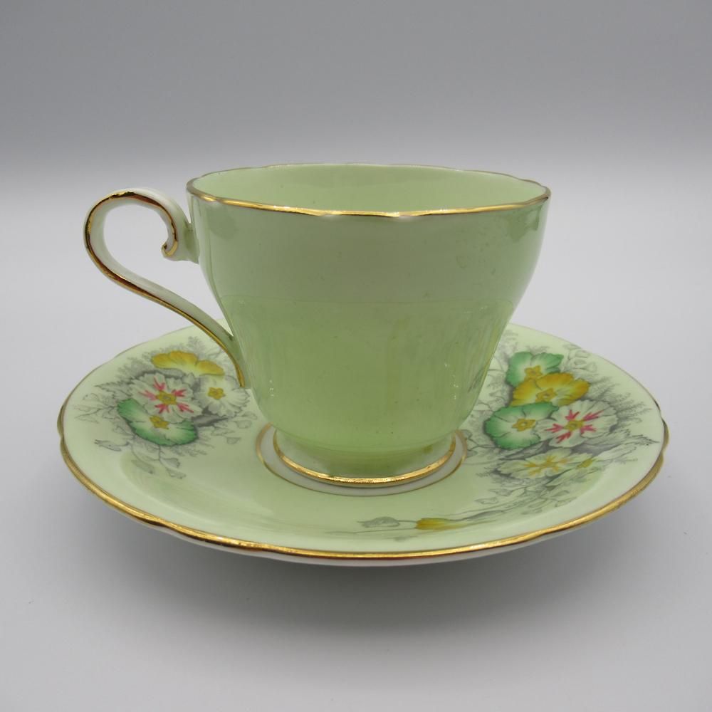 爽やかなグリーンが目を惹くエインズレイのカップ&ソーサー。 カップの中までグリーンで彩られている贅沢な一品です。 カップは"コルセットシェイプ"と呼ばれる特徴的な丸みを持つカップです。 着色の一部がハンドペイントで行われている手の込んだ一品でもあります。
