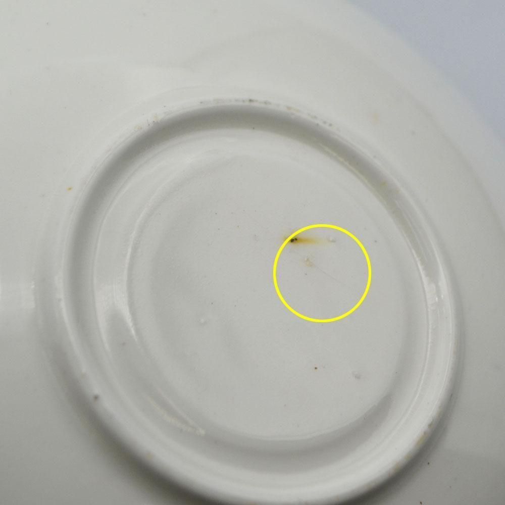焼成の時に出来た粒や黒点、窯傷などがございますがワレ・カケなしの状態良好品です。ソーサーの裏面にキズ(貫入?)が見られますが表面には影響が見られません。